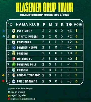 Laga Pegadaian Championship Liga 2, Senin hari ini, 22 September 2025, diketahui memainkan tiga partai di Grup Barat (A). Persekad Depok vs Sriwijaya FC, Adhyaksa FC vs Bekasi City FC, dan Sumsel United vs Persiraja Banda Aceh.