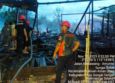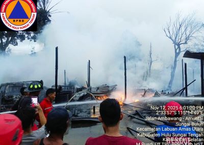 Nusantarasatu.co. BARABAI – Musibah kebakaran melanda permukiman warga di Hulu Sungai Tengah (HST). Kali ini, amukan api memusnahkan tiga rumah warga di Desa Binjai Pirua RT. 06, RW. 03, Kecamatn Labuan Amas Utara (LAU), HST, Rabu sore, 12 November 2025.